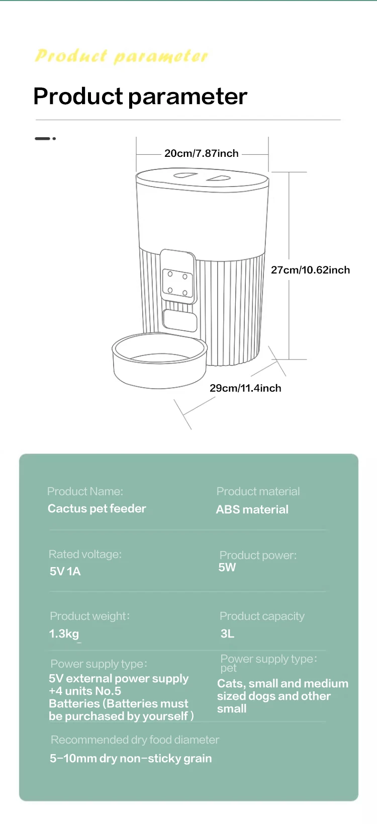 Automatic 3L cat food dispenser with option for wifi or remote smart